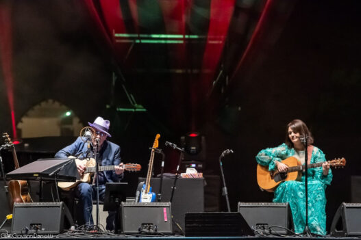 Una breve pausa per un veloce cambio palco ed è il momento di Elvis Costello, accolto sul palco da un grandissimo applauso. Ad accompagnare il 69enne londinese Declan Patrick MacManus (Costello era il cognome della sua bisnonna ovviamente italiana) il pianista Steve Nieve. Finite le formalità di rito dei saluti Costello ci porta nel primo dei suoi diversi mondi sonori. Anche per lui, vista la ridotta strumentazione, sarà l’essenzialità a governare la sua esibizione. L’inizio è affidato a “When I Was Cruel Nr 2”, la cui versione originale vedeva un frammento vocale di Mina e qui resa in versione un po’ desertica e intensa per chitarra elettrica, piano e voce.