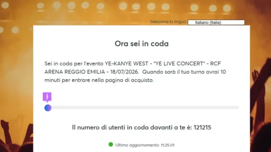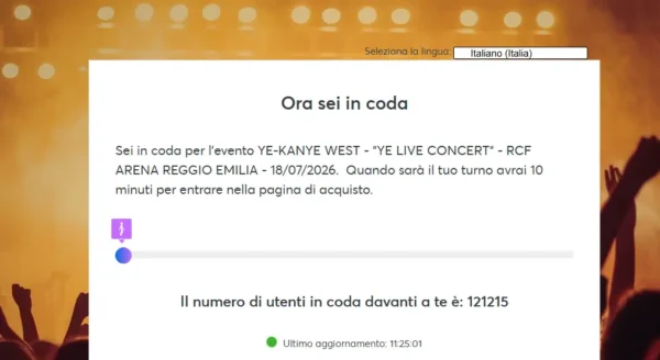 KANYE WEST abbiamo provato a prendere i biglietti. Il numero di utenti in coda davanti a te è: 121215 livenewsTop 22 Dicembre 2025 bynewsic_redazione