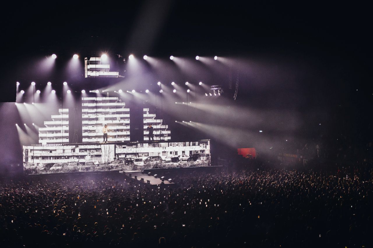Ogni brano ha avuto il suo momento spettacolare: dalla piattaforma che si alza per “Miezz A Vi”, ricreando le iconiche Vele di Scampia, al pianoforte in fiamme su “Mentalité”, fino alla gabbia calata per “Cella 2” e al gran finale con la sparizione improvvisa dell’artista, apparso poco dopo in tribuna. Dettagli che hanno lasciato il pubblico senza fiato.