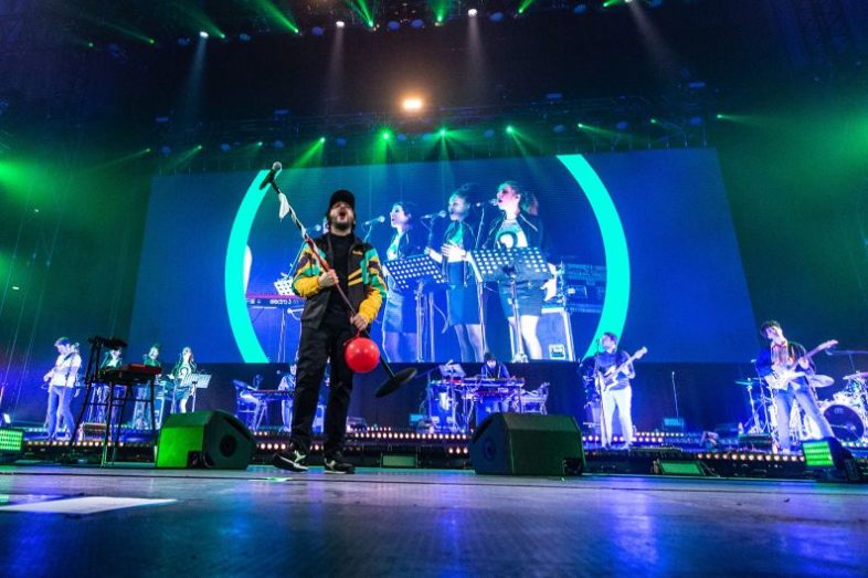 Nelle immagini, Calcutta durante il concerto al Palazzo dello Sport di Roma il 5 febbraio, con un total look firmato Diadora.