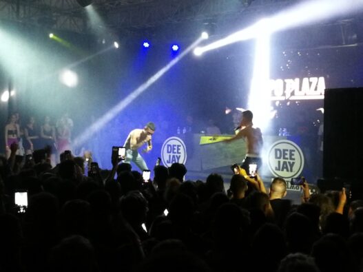 Una marea di giovani dai 14 ai 20 anni. Tutti con gli occhi puntati verso il palco ad aspettare lui. Verso l’una di notte ecco che sale sul palco. Giovane, magretto, occhi da furbo. Il palco è subito suo. Carismatico inizia a cantare le sue barre contornato da una ventina di amici, dj, vocalist, gnocche da tappezzeria, manco fossero gli Earth Wind and Fire nei momenti di gloria.