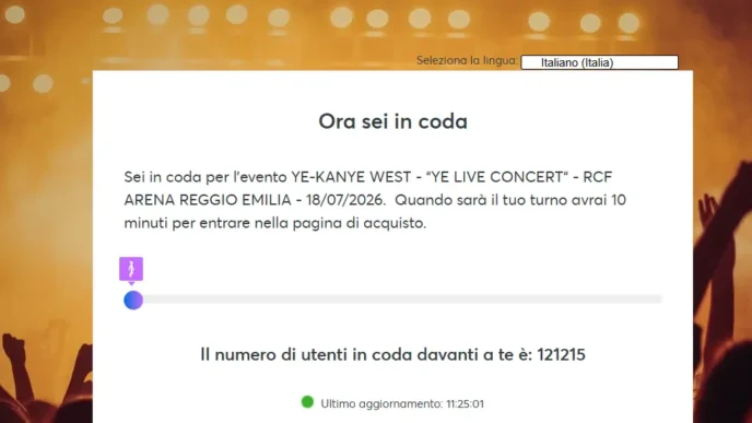 KANYE WEST abbiamo provato a prendere i biglietti. Il numero di utenti in coda davanti a te è: 121215 livenewsTop 22 Dicembre 2025 bynewsic_redazione