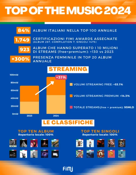 Le classifiche annuali FIMI-GfK (29 dicembre 2023 – 26 dicembre 2024) raccontano un anno di importanti evoluzioni per il mercato musicale italiano, con risultati che confermano tendenze consolidate e ne inaugurano di nuove.