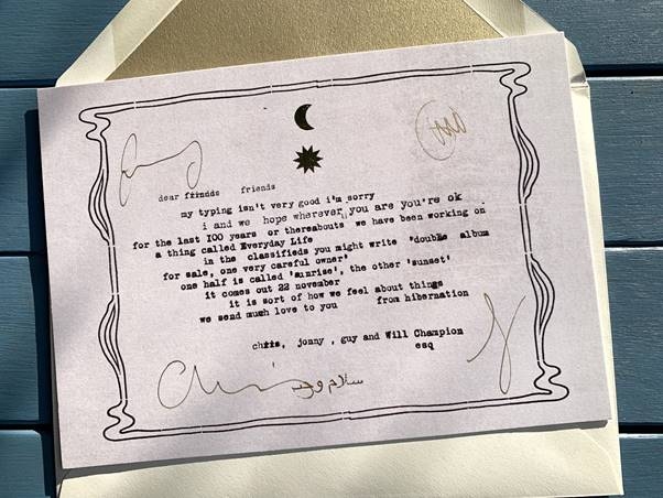 I primi dettagli di Everyday Life sono stati svelati all’inizio della settimana quando la band ha spedito via posta tradizionale un carta autografata a 500 fan in tutto il mondo.