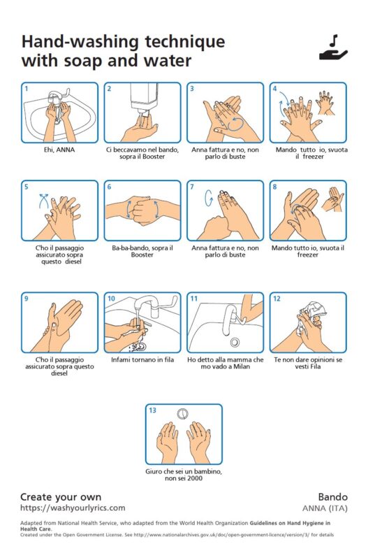 Mentre in Italia l’emergenza sanitaria del Coronavirus sta assumendo numeri sempre più preoccupanti e la campagna principale è quella dello stare in casa e non uscire, in Inghilterra un adolescente di diciassette anni, William Gibson, ha creato un sito chiamato Wash Your Lyrics per “generare infografiche di lavaggio delle mani basate sui testi delle tue canzoni preferite”.