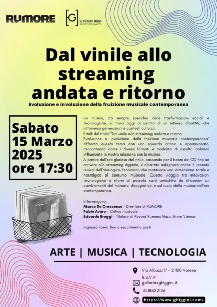 “Dal vinile allo streaming andata e ritorno -Evoluzione e involuzione della fruizione musicale contemporanea” è il titolo dell’incontro che si svolgerà il 15 marzo alla Galleria Ghiggini 1822 di Varese.