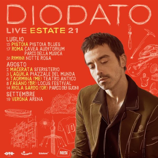Diodato, il cantautore dei record 2020, è stato tra i primi artisti italiani a dare un forte segnale di ripartenza la scorsa stagione estiva con alcuni concerti in location inedite ed esclusive dopo i mesi di lockdown. Queste le date dei live estivi: 15 luglio – Pistoia Blues, Pistoia, 17 luglio – Cavea Auditorium Parco della Musica, Roma, 31 luglio – Notte Rosa, Rimini, 2 agosto – Teatro Sferisterio, Macerata, 3 agosto – Piazzale del Munda, L’Aquila, 6 agosto – Teatro Antico di Taormina, 8 agosto – Locus Festival di Fasano (BR), 14 agosto – Parco dei Suoni a Riola Sardo (OR). Il tour si concluderà il 19 settembre all’Arena di Verona.