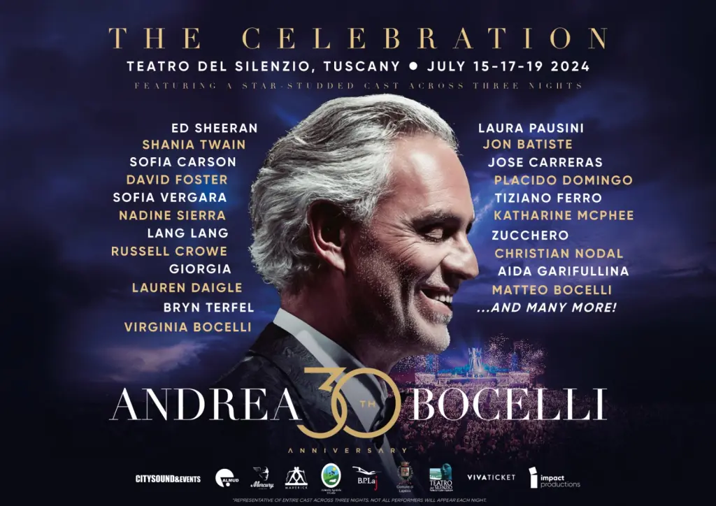 Un cast di superstar internazionali è pronto ad arrivare in Italia, sulle colline toscane, solo per ANDREA BOCELLI 30: THE CELEBRATION, un appuntamento mondiale nato per festeggiare il trentesimo anniversario di carriera di Andrea Bocelli.