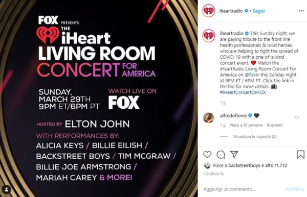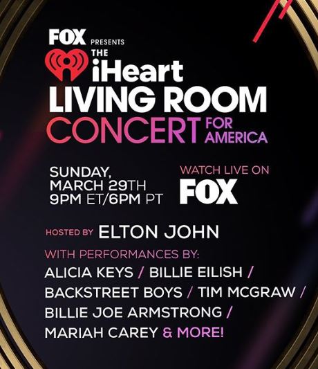 Appuntamento per il 29 marzo 2020 in compagnia di Elton John, Billy Eilish, Mariah Carey e Tim McGraw per l’ “iHeart Living Room Concert for America” contro il coronavirus.