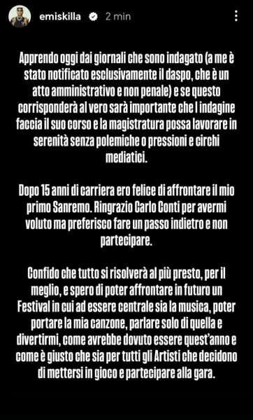Emis Killa potrebbe non partecipare al Festival di Sanremo 2025. In un post sui suoi social scrive: “preferisco fare un passo indietro e non partecipare”.