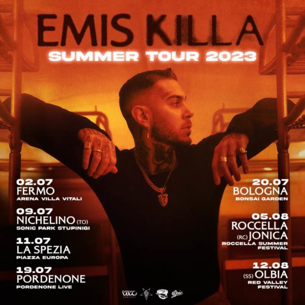 Emis Killa porterà i più grandi successi della sua carriera fino ad “Effetto Notte” in diverse città italiane a partire da Fermo dove domenica 2 luglio 2023 si esibirà all’Arena Villa Vitali. Il tour, prodotto e distribuito da Vivo Concerti, proseguirà poi con la già annunciata data di Nichelino (TO) di domenica 9 luglio 2023 al Sonic Park Stupinigi presso la Palazzina di Caccia di Stupinigi, a La Spezia martedì 11 luglio 2023 in Piazza Europa, a Pordenone mercoledì 19 luglio 2023 al Pordenone Live nel Parco San Valentino, passando per la già annunciata data di Bologna di giovedi 20 luglio 2023 al Bonsai Garden nel Parco Caserme Rosse, a Roccella Jonica (RC) sabato 5 agosto 2023 al Roccella Summer Festival al Teatro al Castello, per terminare con l’appuntamento già annunciato di Olbia (SS) dove sabato 12 agosto 2023 sarà al Red Valley Festival.