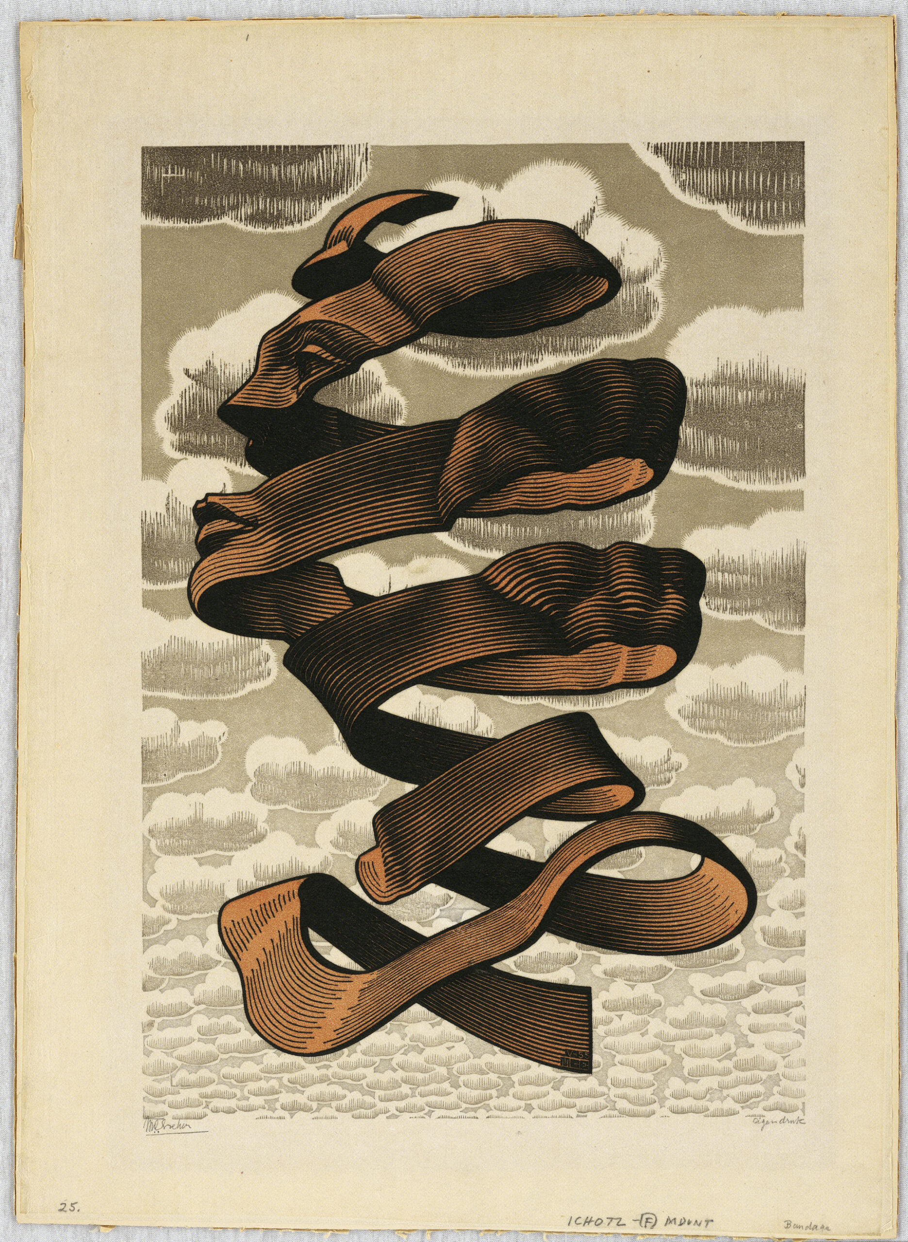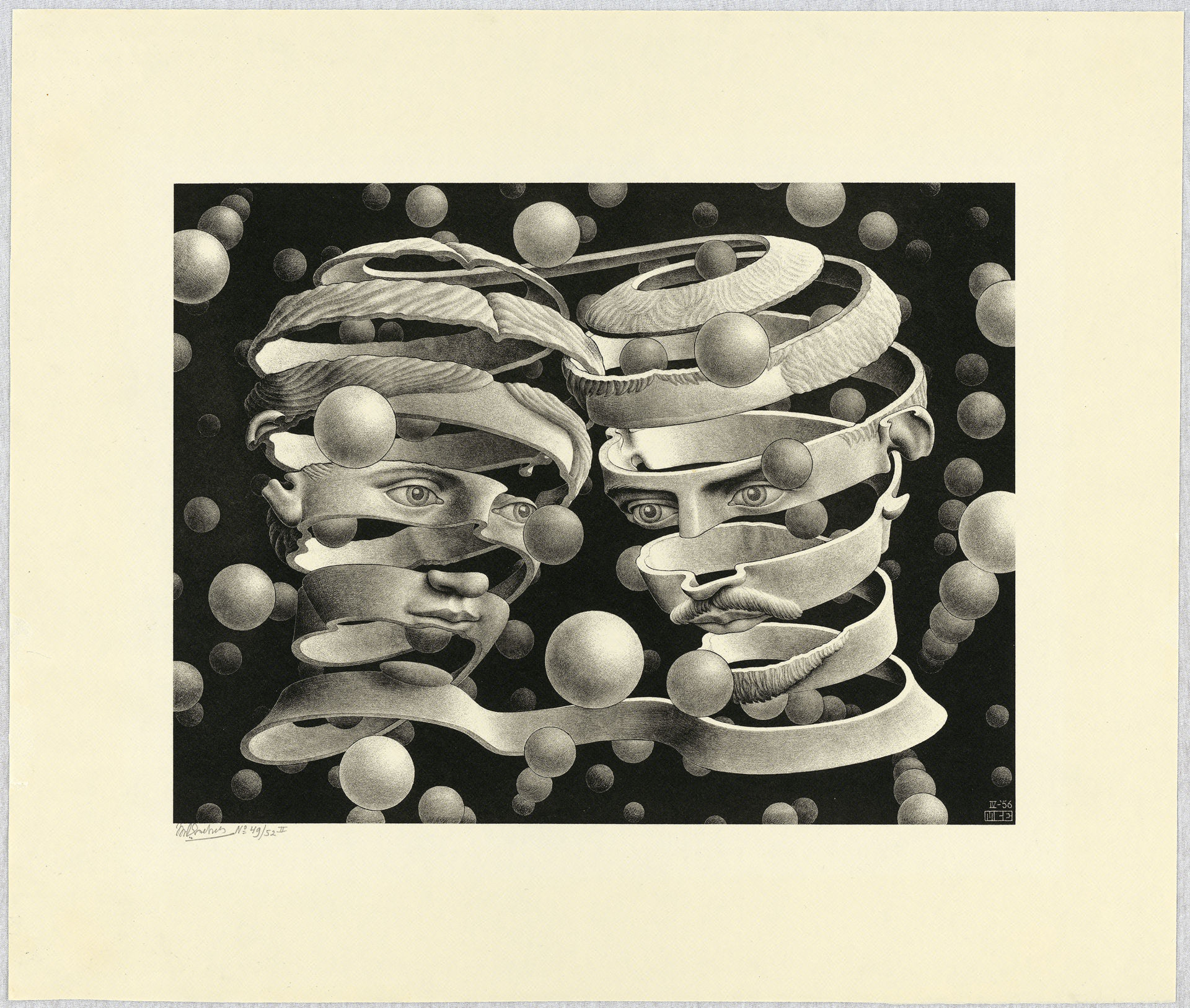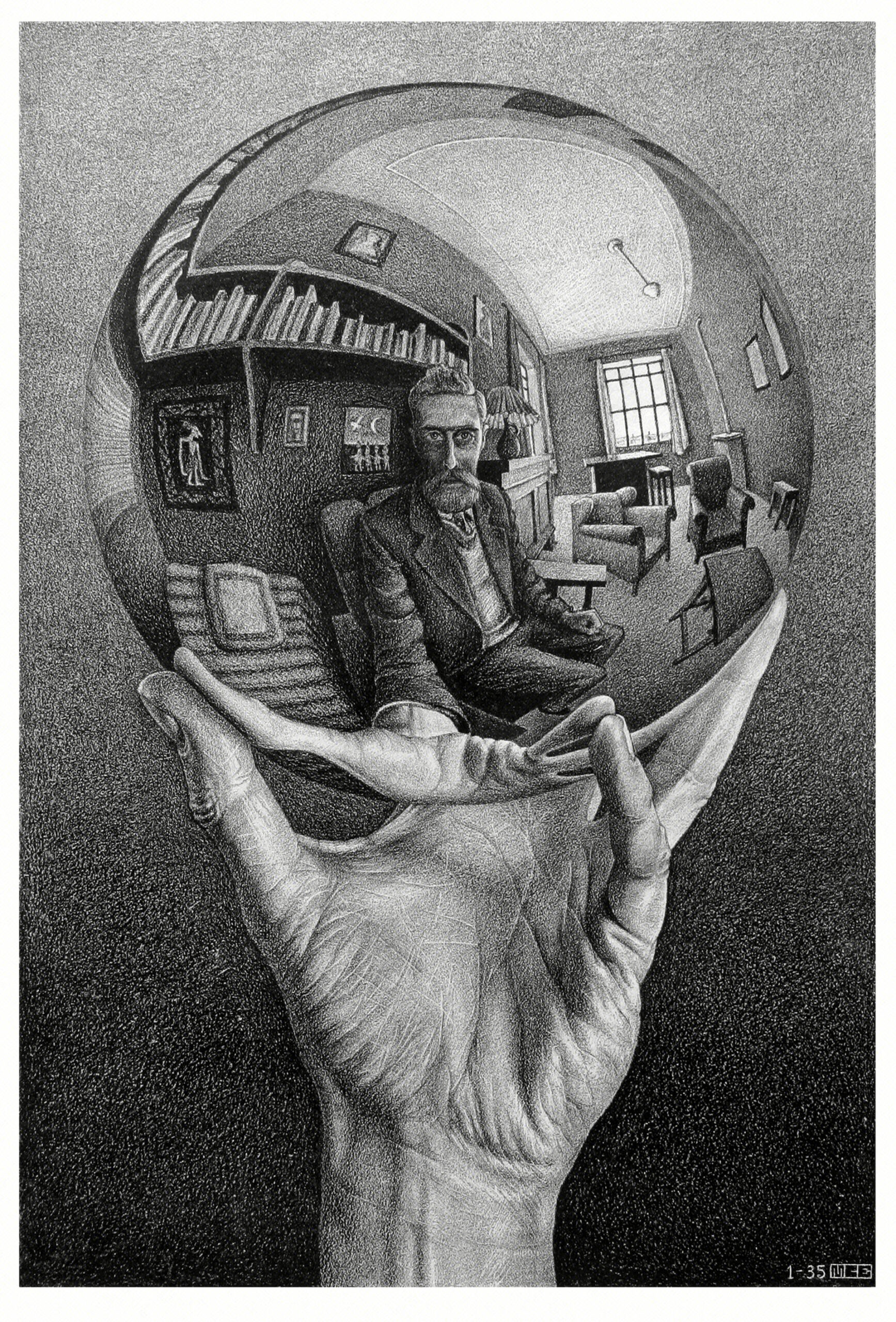 Fin dalle sue prime opere, più ancora che per l’elemento pittorico, Escher dimostra un’attenzione particolare per l’organizzazione dello spazio compositivo. Come abbiamo visto a partire dalla metà degli anni ‘30, Escher si staccherà progressivamente dalla rappresentazione euclidea dello spazio. Il suo crescente interesse per la matematica e la geometria passa attraverso lo studio e il fascino che esercitano su di lui sfere, superfici riflettenti, solidi geometrici o ancora superfici topologiche come il nastro di Möbius, un oggetto percepito come superficie a due facce ma che, ad una più attenta osservazione, ne dimostra una sola. Potremmo parafrasare un suo commento alla litografia Mano con sfera riflettente del 1935, una delle sue opere più celebri, in questo modo: la sfera, riflettendolo, racchiude in sé tutto lo spazio circostante, al cui centro si staglia proprio colui che la guarda; l’uomo è quindi il centro di questo universo. Escher qui non dissimula una certa ironia riguardo all’ego dell’artista, immortalato in una dinamica autoreferenziale. La disamina di questi concetti porterà Escher ad esacerbare il suo gusto per i paradossi, le distorsioni prospettiche e le illusioni ottiche che queste figure permettono.