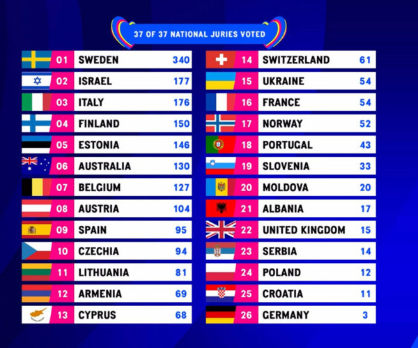 ed ecco la classifica dei vari stati che hanno decretato il successo per la Svezia