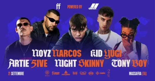 Sabato 21 settembre 2024, live concert presso l’Area Spettacoli (via Potenza 2, nei pressi dello Stadio Comunale di Massafra) con ingresso a pagamento dalle ore 18:00 fino alle 24:00. Opening Act: Rrari dal Tacco, Scaccia, Welo, Young Hash, Niceboy Balenci, Yangl. Main Artists: Kid Yugi, Artie 5ive, Tony Boy, Night Skinny, Noyz Narcos.