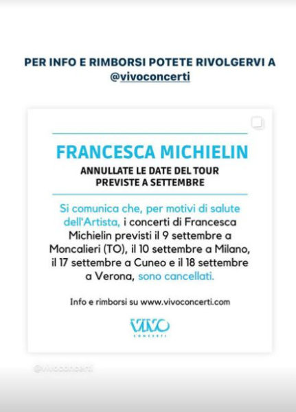 Quindi sono qui per scusarmi con voi, con tutta me stessa, perché mi trovo costretta ad annullare anche le ultime date del tour estivo e i prossimi impegni.
