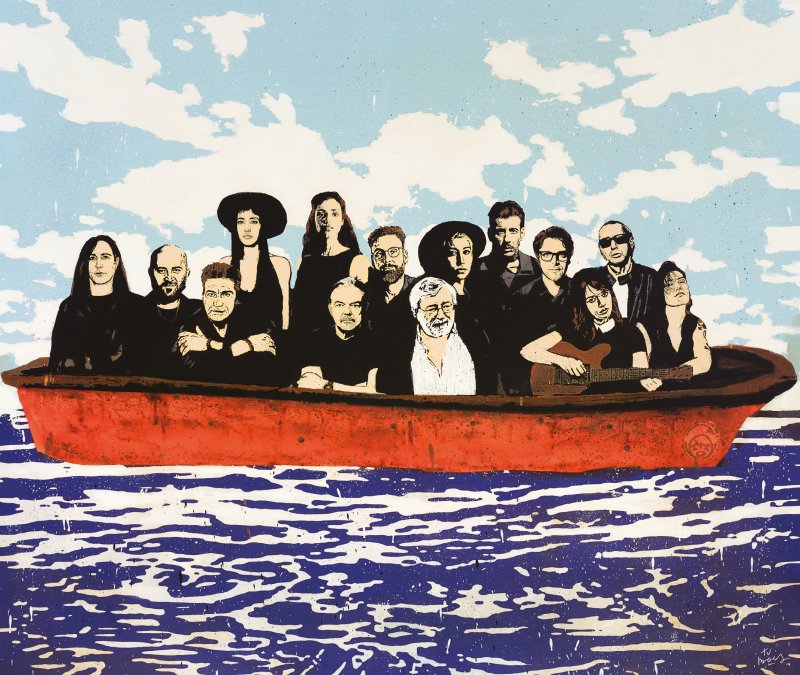 Manuel Agnelli, Malika Ayane, Samuele Bersani, Brunori Sas, Luca Carboni, Carmen Consoli, Elisa, Francesco Gabbani, Ligabue, Giuliano Sangiorgi, Margherita Vicario, Nina Zilli e, al centro, Francesco Guccini con Mauro Pagani tutti su una barca.