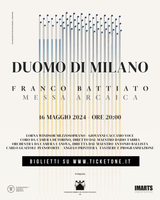 A tre anni dalla scomparsa di Franco Battiato, la Fondazione Franco Battiato, recentemente istituita su iniziativa della presidente Grazia Cristina Battiato, nipote del celebre artista, inaugura le proprie attività con un evento unico in programma il 16 maggio 2024 nel Duomo di Milano con la Messa Arcaica per soli, coro e orchestra, a trent’anni dalla sua prima pubblicazione discografica.
