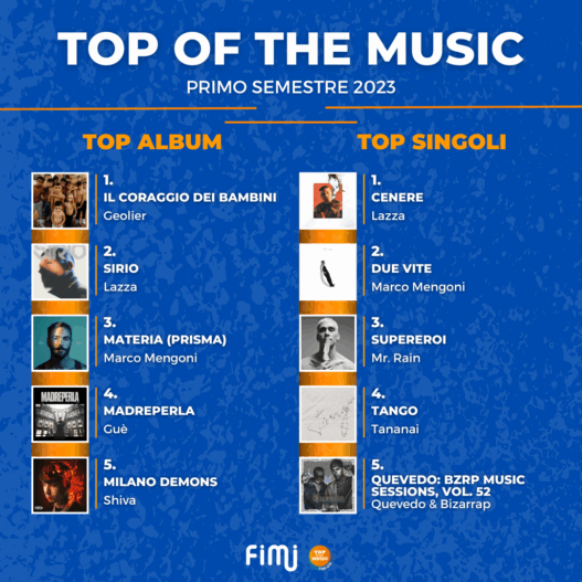 In termini di certificazioni, il primo semestre 2023 chiude con un totale complessivo di 544 titoli tra oro, platino e multiplatino, di cui 95 Album e 449 Singoli: è l’esito degli investimenti e dell’impegno delle etichette nell’aiutare gli artisti a raggiungere il massimo potenziale creativo, in una scena musicale globale interconnessa e sempre più tech driven.