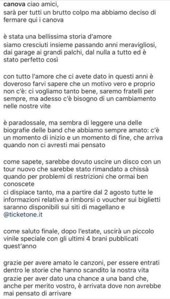 Hanno salutato il loro pubblico (tra i più numerosi della scena indie pop italiana) con un lungo post su Instagram congedandosi con queste parole: “adesso è il momento di lasciare il presente e lanciarsi nel futuro, sappiamo già che continuerete comunque ad amare la nostra musica. Non siate tristi, con immenso amore”.