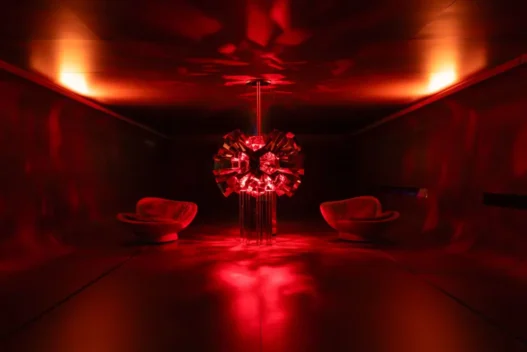 Nel progetto ideato con Sorrentino e la scenografa Margherita Palli, Casacci lavora per immersione. Il suono non è accompagnamento, è sostanza. Le frequenze si fondono con i materiali, con le luci smorzate, con le geometrie sospese. Il visitatore non cammina: galleggia in un tempo dilatato, scandito da vibrazioni più che da secondi. Un tempo emotivo, percettivo, che si muove in controtendenza rispetto al battito frenetico della contemporaneità.