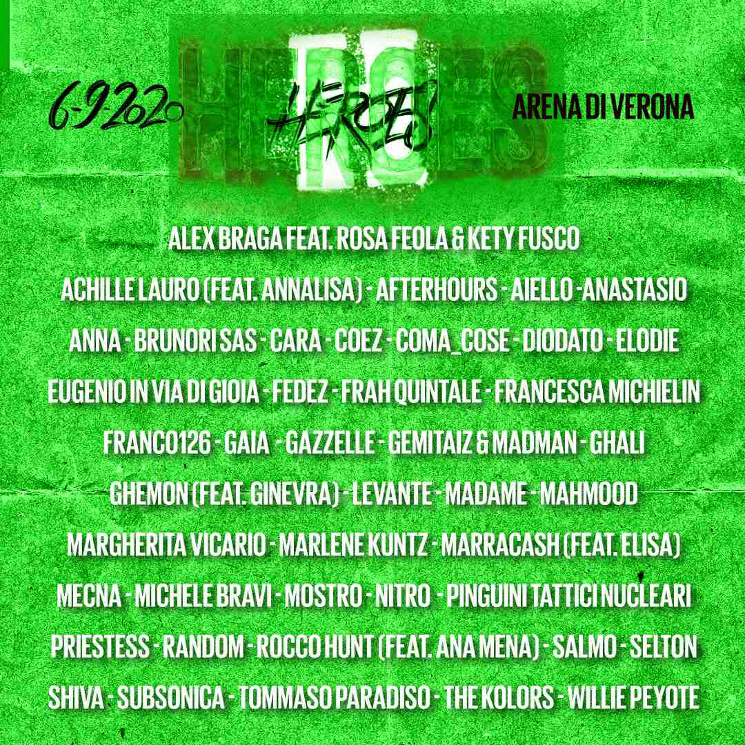 L’ultima novità è l’annuncio dei duetti che va ad arricchire la, già incredibile, Line Up di Heroes: Achille Lauro duetterà con Annalisa, Elisa con Marracash, Rocco Hunt con Ana Mena, Ghemon con Ginevra, Zero Assoluto feat. Gazzelle.