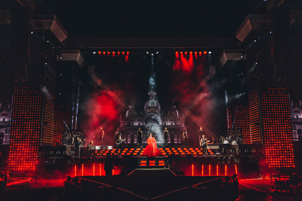Il blocco continua con INVECE NO, ricreando un quadro di angeli viventi che regala al pubblico un momento commovente, e poi RESTA IN ASCOLTO, title track dell’album che le valse un Latin Grammy Award, un Billboard Latin Music Award e, soprattutto, un Grammy Award come Miglior Album Pop Latino dell’anno, e termina con PRIMAVERA IN ANTICIPO, una delle canzoni di Laura da sempre più amate dal pubblico, che quest’anno coinvolge tutti gli artisti presenti, musicisti, cori, ballerini e performer per un finale di secondo tempo molto suggestivo e sugli schermi un omaggio alla città di Venezia.