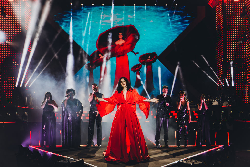 Il blocco continua con INVECE NO, ricreando un quadro di angeli viventi che regala al pubblico un momento commovente, e poi RESTA IN ASCOLTO, title track dell’album che le valse un Latin Grammy Award, un Billboard Latin Music Award e, soprattutto, un Grammy Award come Miglior Album Pop Latino dell’anno, e termina con PRIMAVERA IN ANTICIPO, una delle canzoni di Laura da sempre più amate dal pubblico, che quest’anno coinvolge tutti gli artisti presenti, musicisti, cori, ballerini e performer per un finale di secondo tempo molto suggestivo e sugli schermi un omaggio alla città di Venezia.