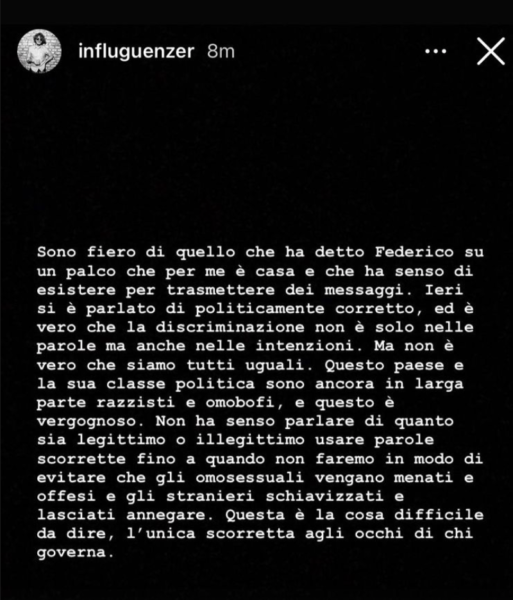 Tanti, naturalmente, gli artisti che hanno espresso sostegno a Fedez sui propri canali social.