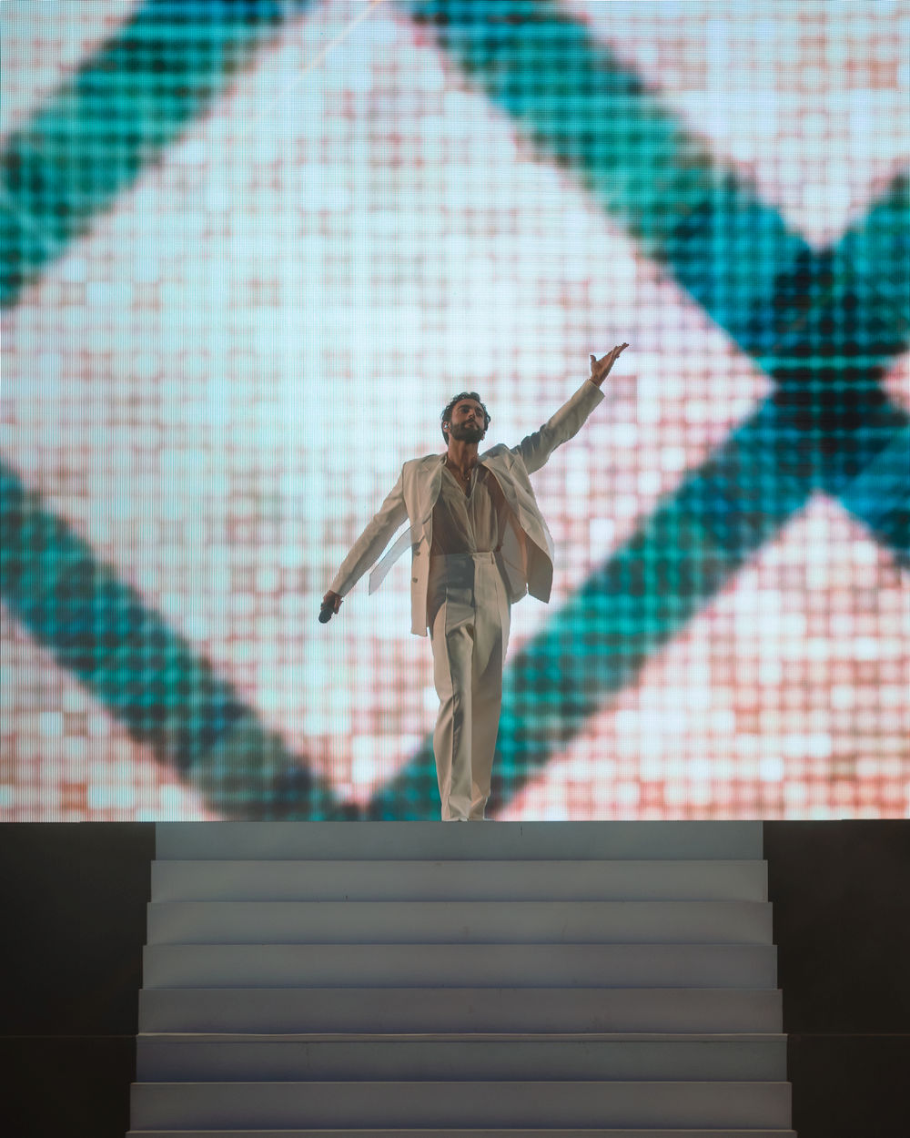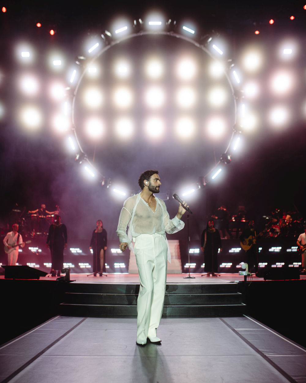 Si spengono le luci e l’attenzione del pubblico viene catturata dalle immagini in bianco e nero sugli schermi laterali, si alternano ricordi, momenti che tutti i fan riconoscono, dettagli di backstage, live, momenti più intimi di Marco, come a voler unire il pubblico in un flash back collettivo ed emotivo. La voce di Marco pronuncia alcune parole chiave come: salva tutto, ricordi, memorie, non scappare, salva. Un invito a raccogliere e convogliare le energie del singolo viaggio personale di ogni spettatore in quel momento di condivisione totale con Marco e gli altri presenti, tanto che le immagini ci mostrano live gli ultimi istanti della preparazione di Mengoni e lo seguono nel suo ingresso nello stadio: intonando Cambia un uomo, il brano manifesto dell’ultimo album, che parla della necessità di affrontare le paure, di accettazione e condivisone tra esseri umani, Marco appare tra il suo pubblico (un ingresso che recupera il mood dei grandi raduni musicali degli anni 70) e attraversa il parterre per salire sul palco circolare al termine della passerella, raggiunto dai coristi e Peter Cornacchia alla chitarra. Sugli schermi le immagini di Marco si fondono con quelle del pubblico tutto in bianco e nero; arriva poi Esseri umani, uno dei brani più amati dal pubblico e che per questa occasione acquisisce sfumature dal richiamo pop internazionale e maggiore libertà nell’esecuzione. Sugli schermi immagini degli spettatori che diventano gli “esseri umani” protagonisti della canzone fuse con immagini di Marco, che lascia spazio al pubblico invitandolo a cantare insieme. Gli schermi si accendono di blu, allineandosi all’outfit di Marco, in completo oversize Marni, che invita San Siro a fare “un passo di dance”. Il palco si accende, è il momento di No stress, l’ultimo singolo in vetta alle classifiche radiofoniche fin dall’uscita lo scorso 6 maggio, un inno energico e vitale, un invito a muoversi in totale libertà, come fa lo stesso Mengoni che viene raggiunto anche da sei ballerini (coreografati da Macia Del Prete) che si moltiplicano sugli schermi per un momento di liberazione collettiva.