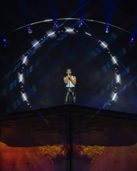 Marco scompare sul retro del palco e sugli schermi appaiono due Mengoni, uno in bianco e uno in nero, che sembrano – tra leggerezza e ironia – sfidarsi in una serie di passi di danza, per poi moltiplicarsi anche sul led centrale, come a rappresentare le diverse anime che il cantautore ha mostrato in questi anni. Cambia l’atmosfera, diventa dominante il rosso, le luci dell’Halo circolare, ora perpendicolare alla base del palco, si fanno pulsanti, seguendo il ritmo sempre più veloce che sfocia nell’attacco di Voglio. È show puro quello che vede Mengoni innalzato su un elevatore (4 metri) al centro del palco principale incorniciato dal Ring come in un cerchio infuocato, gli stacchi del pezzo vengono sottolineati anche dalle 8 fiamme alte 10 metri che puntellano il fronte palco. A sottolineare il cambio set anche l’outfit: una canotta di rete metallica e un pantalone nero, disegnati appositamente per lo show da Versace. Segue Mohammed Alì, accompagnato da immagini di cronometri e countdown, a sottolineare come “Qui si vince o si perde in un attimo”, una riflessione su come anche le cadute siano funzionali a capire come resistere e affrontare la vita, su come spesso il nostro peggior nemico “ci sorrida allo specchio”. Si torna poi agli esordi di Marco, nel 2009, con una delle cover che lo hanno reso noto al grande pubblico; in scaletta arriva, infatti, Psycho Killer, la canzone più punk dello show che racconta i condizionamenti e i fili invisibili che spesso ci manovrano. Qui gli anni 70 entrano anche negli schermi che si popolano di inquietanti immagini ispirate agli horror di quegli anni. Si rimane ad inizio carriera, nel 2010 con Credimi Ancora, qui in una potente versione rock tra chitarre distorte, fiamme e luci pulsanti. Dal punk rock si scivola verso il funky con l’arrangiamento live di Mi Fiderò, che si apre con l’immagine di un intenso abbraccio, è la voglia e necessità di unirsi quando ci si affida ad un’altra persona. I visual raccontano poi l’incontro di colori che inevitabilmente mischiandosi diventano altro, con tutta la loro forza esplosiva. Questo segmento di show si chiude con Solo due Satelliti, una canzone con una sua personale atmosfera, creata da un uso sapiente e particolare dei cori, al termine Marco lascia il palco.