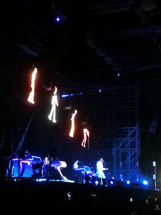 Il poliedrico artista, produttore, designer e regista belga è accompagnato dalla sua band quasi incapsulata in delle strutture luminose che sembrano delle vie di mezzo tra tapis-roulant e astronavi.