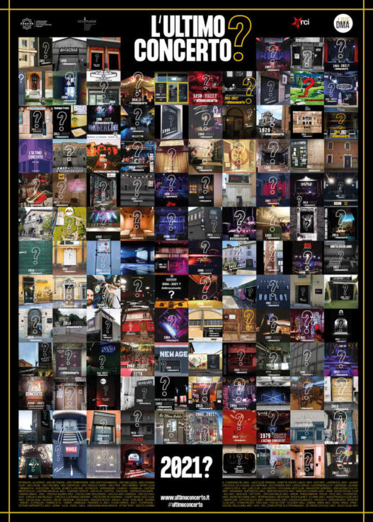 L’Ultimo Concerto? è un’iniziativa promossa da KeepOn Live, Arci e Assomusica, con la collaborazione di Live DMA, che vede insieme, per la prima volta, oltre centotrenta live club e circoli sparsi sull’intero territorio italiano. Una campagna partita il 28 gennaio, giorno in cui tutti i locali coinvolti hanno pubblicato le immagini delle proprie facciate, sovrastate da un punto interrogativo. L’obiettivo primario è quello di porre l’attenzione sull’assoluta incertezza e instabilità in cui versano attualmente queste realtà.