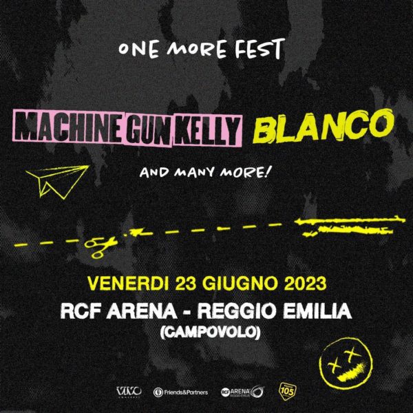 La voce di punta del pop-punk internazionale MACHINE GUN KELLY – reduce dal SOLD OUT della data al Mediolanum Forum di Milano dello scorso 27 settembre – e l’artista da record che con il suo BLU CELESTE TOUR ha totalizzato 35 date interamente SOLD OUT, BLANCO, si riuniscono in un’unica data, prodotta e organizzata da Vivo Concerti e Friends & Partners, che li vedrà esibirsi come nomi principali al ONE MORE FEST venerdì 23 giugno 2023, alla RCF Arena – Reggio Emilia (Campovolo).