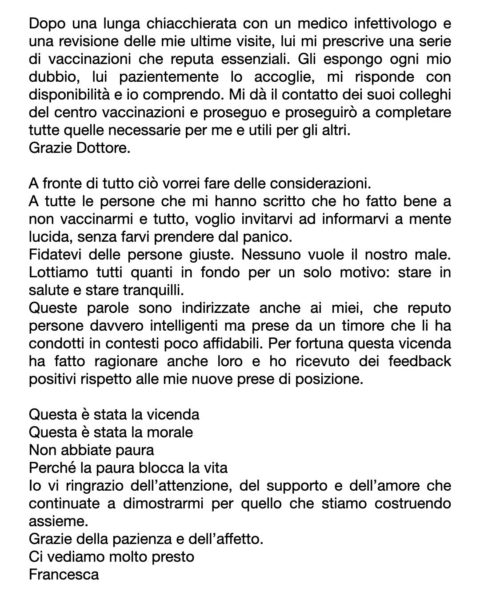 scrive nel nuovo post pubblicato sui suoi social che sostituisce quello postato ieri e poi cancellato,  e conclude la missiva virtuale con una autocitazione dell titolo del brano che porterà al festival.