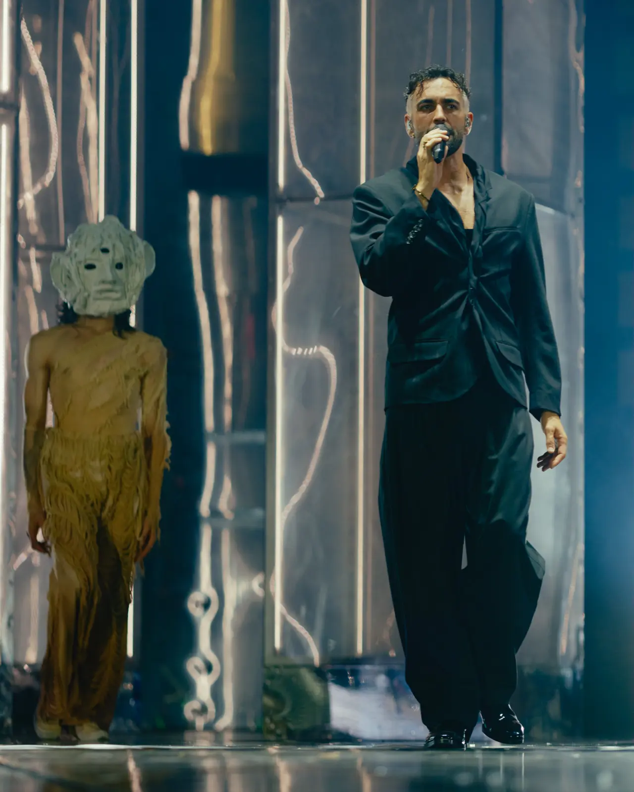 Lo show si apre con una scena dominata da grandi macerie: resti di architetture crollate, blocchi spezzati e frammenti sospesi, realizzati con tecniche teatrali e movimentati attraverso carri motorizzati. Ad un certo punto si scopre al centro del palco un’installazione trasparente, che rappresenta edifici di cristallo, fragili eppure resistenti, simbolo della nostra umanità. Grazie a un sistema interno di luci e macchine del fumo, queste strutture si trasformano in elementi scenici dinamici che modificano la propria densità visiva, evocando architetture trasparenti in continua mutazione. A fondo palco, uno specchio amplia la percezione dello spazio e raddoppia gli elementi scenici, accentuando l’effetto di profondità e contribuendo a una visione teatrale stratificata e illusoria. Grazie a un’impressionante passerella mobile di ventisei metri che si alza e ruota, Mengoni è capace di raggiungere anche lo spettatore più lontano per portarlo dentro a questo show che rappresenta una riflessione collettiva.