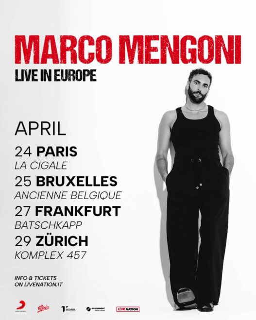 Marco Mengoni parte con un mini tour di quattro date in importanti città europee: il 24 aprile a Parigi, il 25 aprile a Bruxelles, il 27 aprile a Francoforte e il 29 aprile a Zurigo.