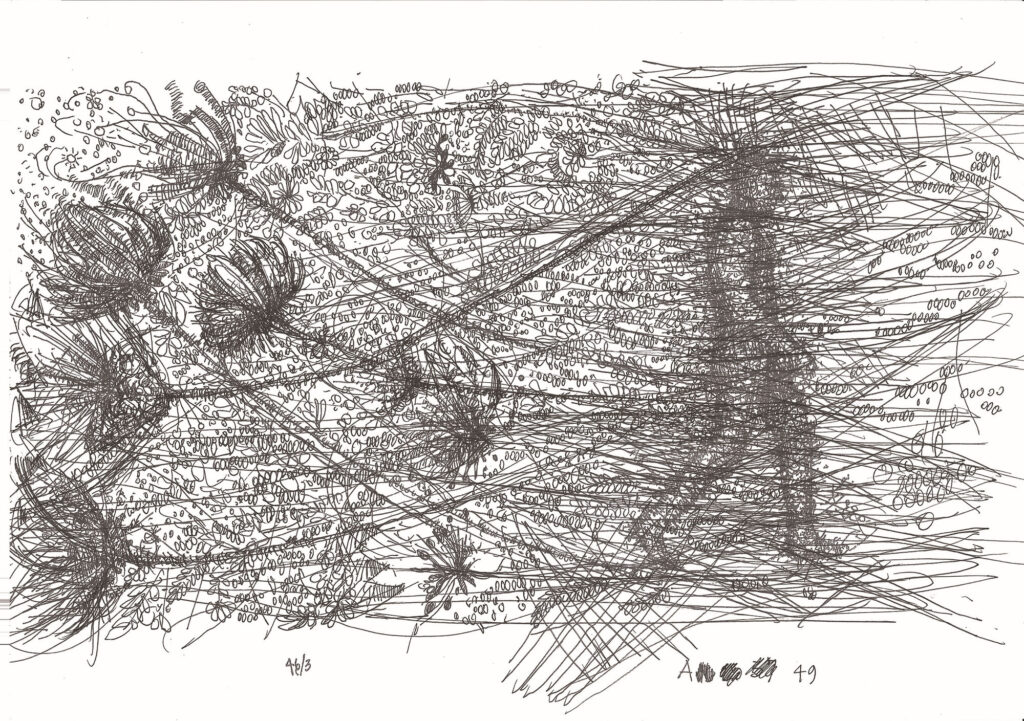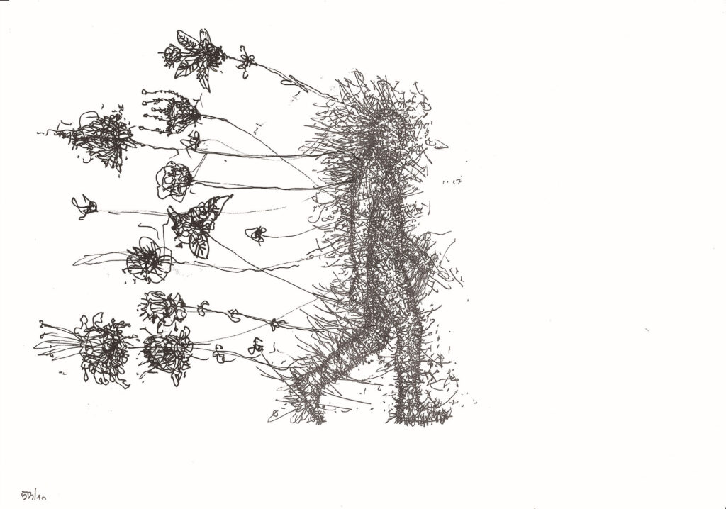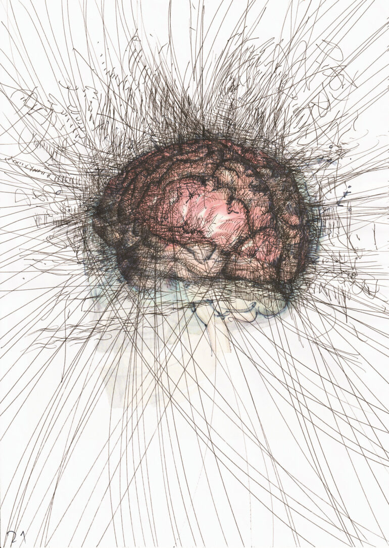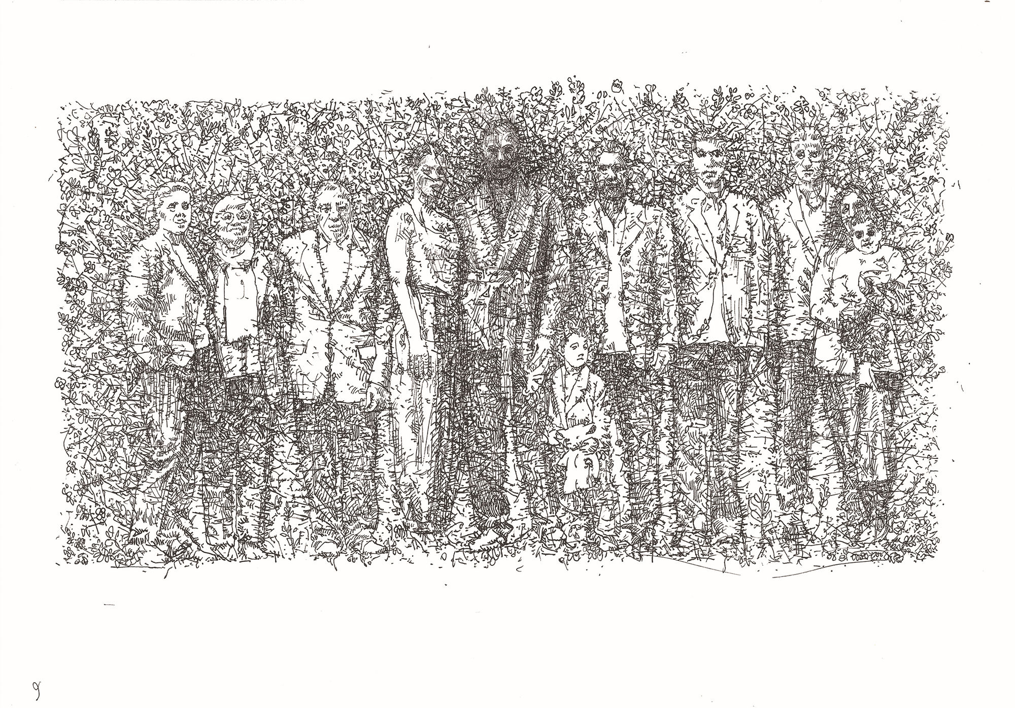 Un corpo maschile dalla linea pulita cammina, nero su bianco, ha le idee chiare, poi arrivano i problemi, la linea si riempie di piccoli segni, che si ammassano sul suo profilo. Sopraggiungono i pensieri, come lunghi filamenti, linee pulsanti che si diramano verso l’esterno. L’immagine della riunione di famiglia è subito sostituita dall’iconica scultura di Alberto Giacometti, il suo uomo che cammina, il simbolo della solitudine nelle criticità esistenziali…”