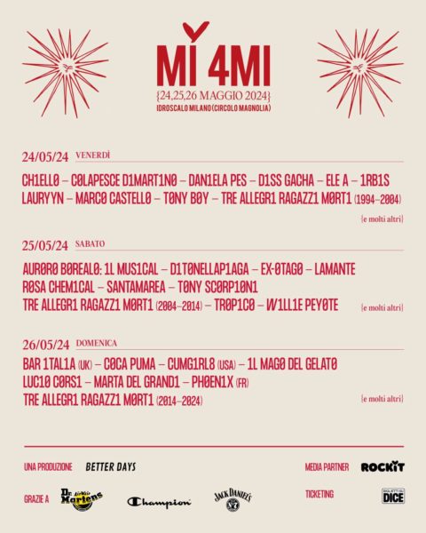 Ci sono anche dei graditissimi ritorni. A cominciare da Marco Castello, cantautore siciliano tra funk e jazz che nel 2023 ha firmato il bellissimo disco “Pezzi della sera”, e Rosa Chemical, che era salito sul palco del MI MANCHI nel 2021 e che ora è pronto a godersi un MI AMI senza distanziamento sociale, il tutto dopo l’enorme successo riscosso con la sua partecipazione a Sanremo nel 2023. In bill anche Il Mago Del Gelato, band rivelazione dell’anno scorso con un incredibile mix di afrobeat, library music ed elettronica, e Tony Scorpioni, cavaliere steampunk con voce sensuale e tanto carisma.