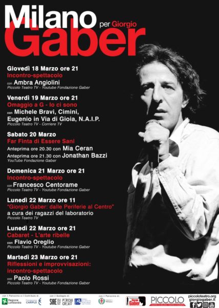 La Fondazione Giorgio Gaber, in collaborazione con il Piccolo Teatro di Milano, malgrado la chiusura delle sale e l’impossibilità di presentare un cartellone “dal vivo”, ha deciso per un programma di appuntamenti in digitale per non rinunciare ai propri fini divulgativi in partenza giovedì 18 marzo fino a martedì 23 marzo.