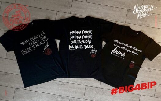 Con il patrocinio di Warner Chappell Music Italiana e la collaborazione di FanShopping, l’idea di BIG4BIP nasce per sostenere Bauli In Piazza, movimento dei professionisti e delle aziende che lavorano nel settore spettacolo ed eventi, e vede coinvolti 3 dei più importanti Artisti della scena rock italiana, che hanno scelto per l’occasione alcune parole significative tratte da loro grandi successi.