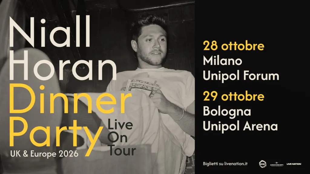 Due date italiane per Niall Horan: il 28 ottobre 2026 all’Unipol Forum di Milano ed il 29 ottobre all’Unipol Arena di Bologna nell’ambito della leg europea e UK del nuovo tour internazionale Dinner Party Live On Tour.