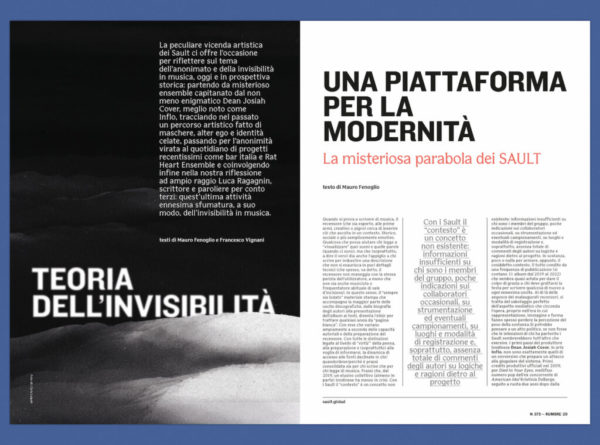 Il nuovo numero di Rumore ha come cover story uno speciale dedicato agli artisti che hanno fatto della maschera e dell’invisibilità il loro primario credo artistico. Concentrandoci sulla vicenda degli ineffabili quanto formidabili inglesi Sault, è possibile leggere un servizio polifonico che dal passato a oggi, dai Residents in giù, cerchi di raccontare quanto abbiano pesato maschere e identità sconosciute all’interno della lunga storiografia musicale. Domandandoci come sia mai possibile rimanere anonimi oggi, nell’era dei social media e dell’acceso totale. I Sault ce la stanno facendo e noi, per illustrare il tutto, abbiamo convocato il nostro illustratore di fiducia. Alessandro Baronciani ha risposto presente, realizzando per noi una copertina esclusiva e integralmente disegnata a mano: dove trovate un cast ideale, sospeso tra passato e presente, di tutti questi famosi sconosciuti del pentagramma.