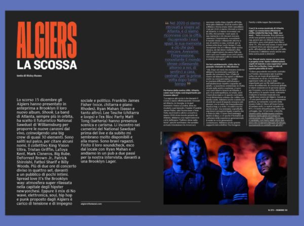 Un ritorno che in tanti attendevamo con curiosità è quello degli americani Algiers – già nostri beniamini e facce da copertina, ora alle prese con un quasi concept discografico. Li abbiamo incontrati di persona a New York City, durante una presentazione speciale del nuovo album. Ricky Russo, con la sua intervista da inviato speciale, riafferma il quartetto americano fra i migliori al mondo quanto all’uso di chitarre di derivazione sperimentale. Vista poi la sensibilità politica della band e i temi da questa affrontati, ne abbiamo approfittato per fare il punto sulla resistenza afroamericana aggiornata al 2023: tra il ritorno di Zack De La Rocha dei Rage Against The Machine e le voci contemporanee che rilanciano un tema ancora e sempre al centro del dibattito occidentale.