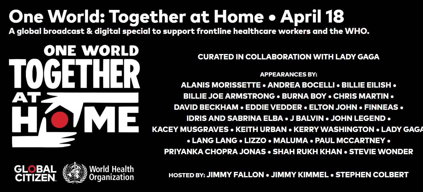 “One World: Together at Home” è il titolo del concerto di beneficenza che vedrà la partecipazioni di tante star della musica insieme per raccogliere fondi per l’emergenza sanitaria del Covid-19.