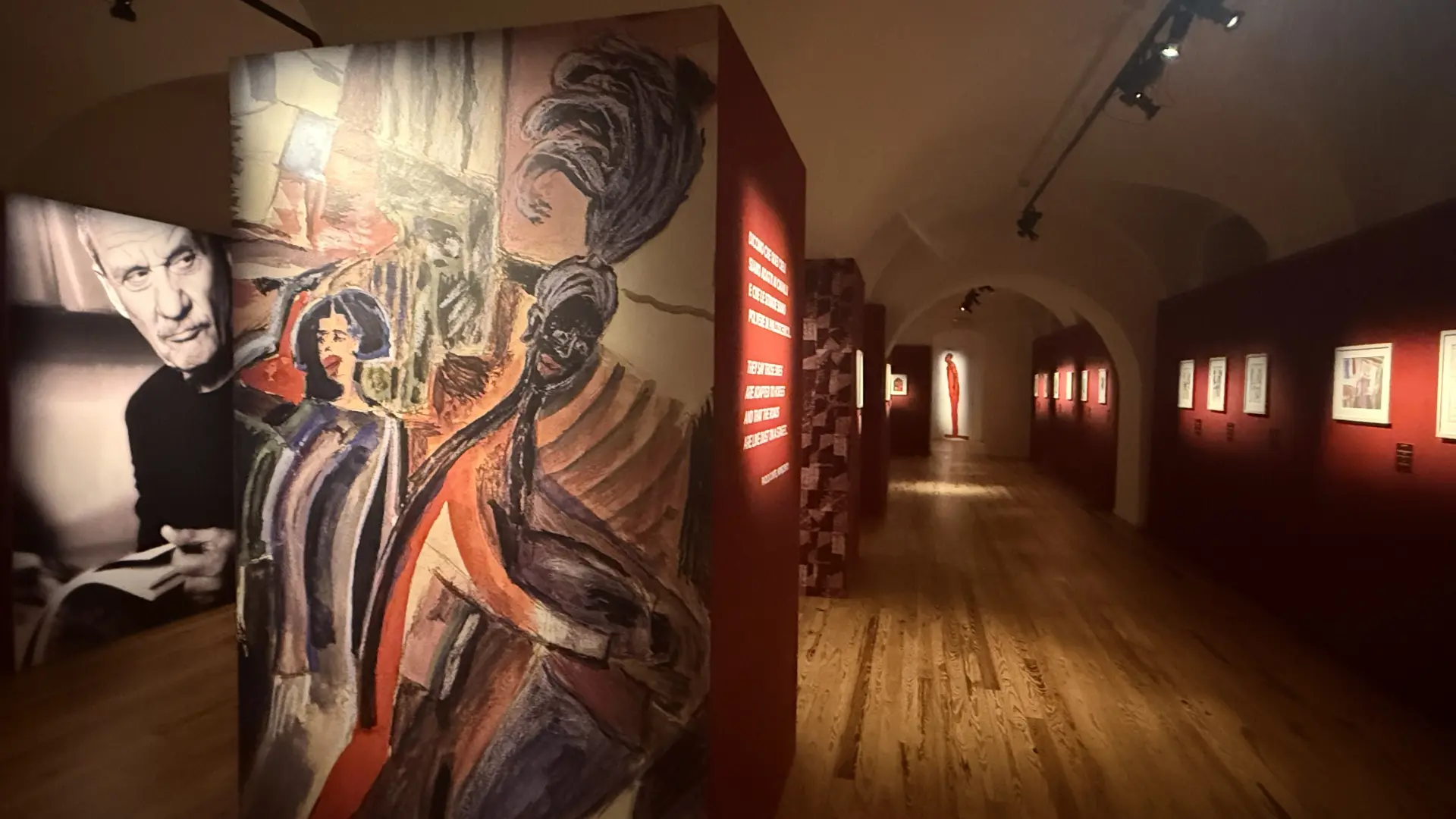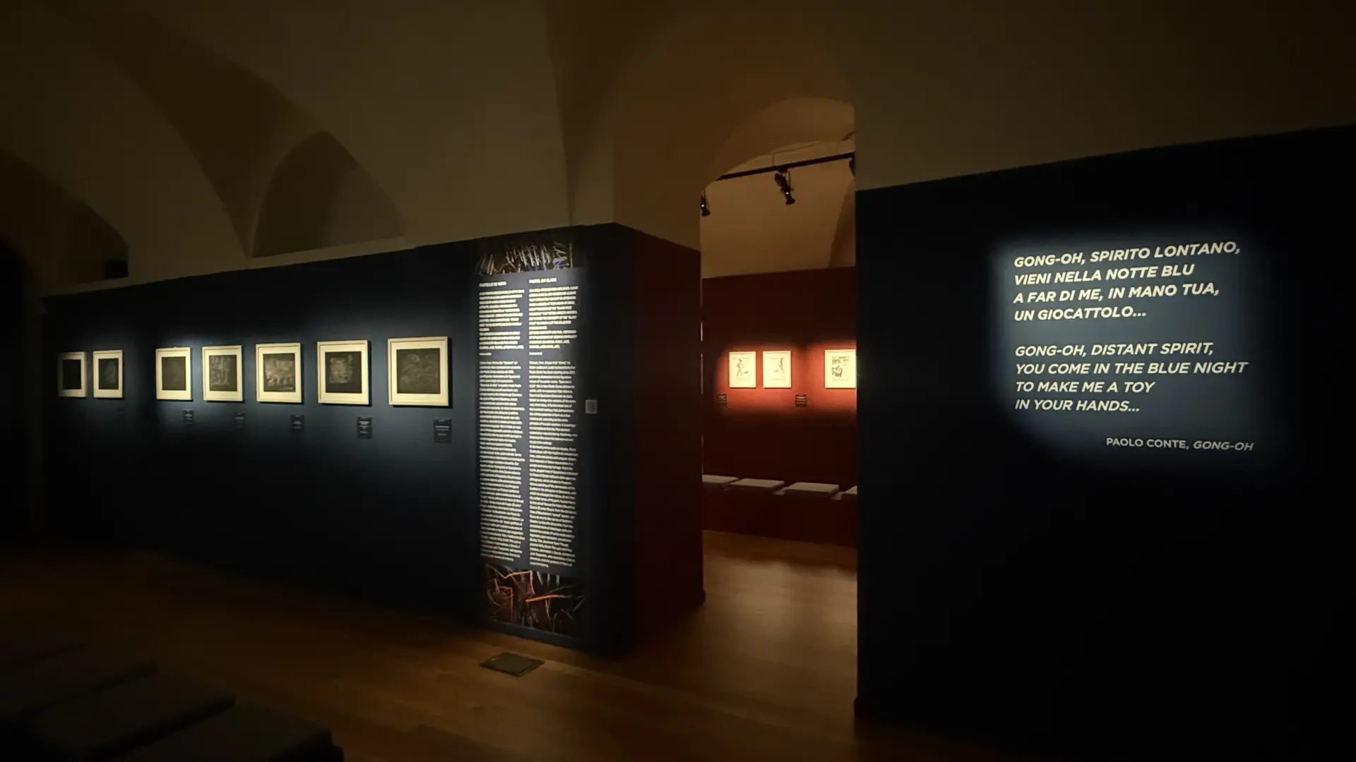 Infine una terza sezione di opere su cartoncino nero in cui Paolo Conte si affida alla suggestione delle linee e dei colori in un omaggio garbato, talvolta venato di ironia, alla musica classica, al jazz, alla letteratura, all’arte. Specificità della mostra è inoltre il percorso espositivo: le opere si susseguono secondo una scelta scrupolosa e sorprendente, espressione del suo universo poetico assolutamente singolare. E questo non poteva che avvenire sotto la guida stessa del Maestro Paolo Conte, e del suo sguardo autentico, inimitabile, original, con una sola avvertenza: