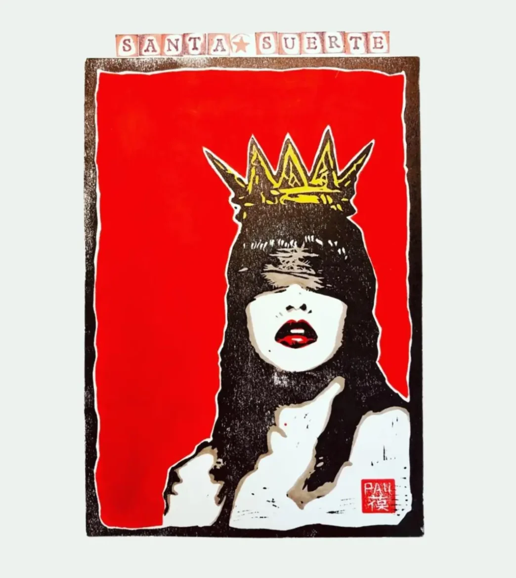 Pau-_-Santa-Suerte-Red-32-x45-c.-21x315-s.-Linocut-retouche-con-acrilico-markers-e-timbri