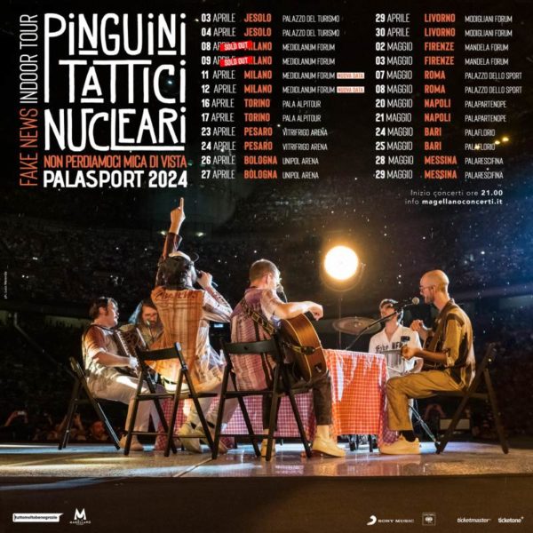 Continua così, in una versione più intima e confidenziale, il tour che quest’estate ha portato i PINGUINI TATTICI NUCLEARI a incontrare fan di ogni età, da Nord a Sud fino alle isole. Dopo la calorosa accoglienza che il pubblico ha riservato alla band, Riccardo, Elio, Nicola, Simone, Matteo e Lorenzo decidono di tornare ad abbracciare il proprio pubblico nei palasport per continuare a raccontare la storia di una giovane band che negli anni ha saputo alternare grandi hit a brani cantautorali, capaci di far sorridere e di far pensare.