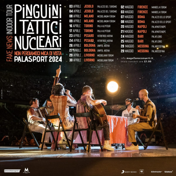 Continua così, in una versione più intima e confidenziale, il tour che quest’estate ha portato i PINGUINI TATTICI NUCLEARI a incontrare fan di ogni età, da Nord a Sud fino alle isole. Dopo la calorosa accoglienza che il pubblico ha riservato alla band, Riccardo, Elio, Nicola, Simone, Matteo e Lorenzo decidono di tornare ad abbracciare il proprio pubblico nei palasport per continuare a raccontare la storia di una giovane band che negli anni ha saputo alternare grandi hit a brani cantautorali, capaci di far sorridere e di far pensare.