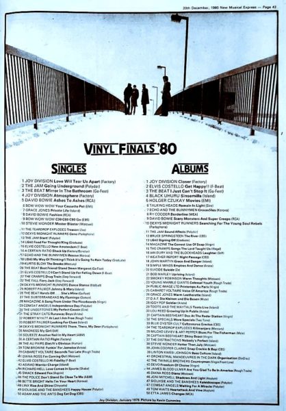 La classifica dei singoli e album è un condensato di new wave, rockabilly, dance e ska. Tanti pezzi storici che hanno segnato indelebile la storia della vita. Ai primi posti della classifica album e di quella singoli la stessa band: i JOY DIVISION. La band di Manchester era in vetta nella classifica album con “Closer” l’album postumo e con il singolo , Love Will Tear Us Apart, album e singolo pubblicati dopo la morte suicida del leader della band Ian Curtis avvenuta il 18 maggio del 1980. Dietro ai Joy Division nei singoli: i The Jam di Paul Weller e i The Beat, mentre tra gli album alla numero due Elvis Costello e i The Beat. Per celebrare quegli anni abbiamo compilato una playlist con i cinquanta singoli. Buon viaggio nel 1980!!!LA CLASSIFICA