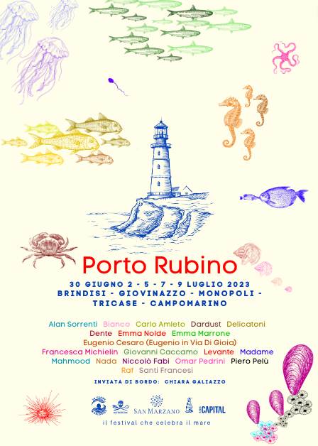 A bordo di incantevoli imbarcazioni, incorniciate da suggestivi scorci pugliesi, sullo speciale palco di PORTO RUBINO si avvicenderanno numerosi ospiti d’eccezione: il 30 giugno a Brindisi ci saranno ad aprire le danze con un primo appuntamento gratuito Eugenio Cesaro (Eugenio in Via Di Gioia), Mahmood e Omar Pedrini; il porto di Giovinazzo (BA) accoglierà per la prima volta il Festival il 2 luglio per il secondo evento gratuito della rassegna, ospitando Madame, Emma Nolde, i Santi Francesi e Alan Sorrenti; a Monopoli (BA) il 5 luglio sarà invece la volta di Bianco, Giovanni Caccamo, Niccolò Fabi e Piero Pelù; nel porto di Tricase (LE) il 7 luglio si avvicenderanno Carlo Amleto, Delicatoni, Levante, Nada, Raf; Dardust, Dente, Emma Marrone e Francesca Michielin chiuderanno in bellezza il festival con l’appuntamento finale del 9 luglio a Campomarino di Maruggio(TA).